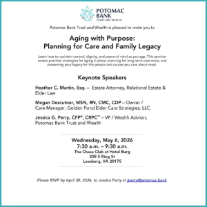 Learn how to maintain control, dignity, and peace of mind as you age. This seminar covers practical strategies for aging in place, planning for long-term care costs, and preserving your legacy for the people and causes you care about most.