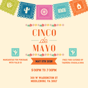 Celebrate Cinco de Mayo at the Middleburg Community Center on Tuesday, May 5, 2026, from 5:30-7:30 PM. Enjoy a festive evening of delicious, complimentary food by Taqueria Guadalajara, along with margaritas, beer, and wine available for purchase. Gather with friends and neighbors for a lively and welcoming celebration in the heart of Middleburg, perfect for a fun night out!