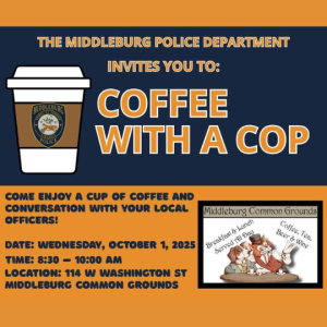 You’re invited to join the Middleburg Police Department for Coffee with a Cop at Middleburg Common Grounds! Enjoy coffee and conversation with our town’s police officers!