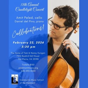 The Community Music School of the Piedmont is pleased to present its 18th Annual Candlelight Concert on Sunday, February 22nd at 5:30, hosted in the beautiful home of Tom and Nancy Dungan. This distinguished evening of chamber music features internationally acclaimed cellist Amit Peled with pianist Daniel del Pino.