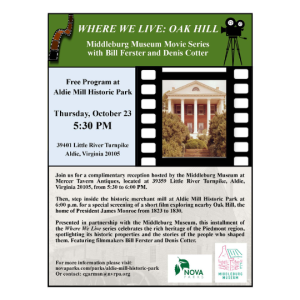 Then, step inside the historic merchant mill at Aldie Mill Historic Park at 6:00 p.m. for a special screening of a short film exploring nearby Oak Hill, the home of President James Monroe from 1823 to 1830.