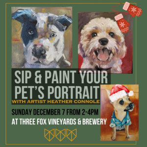 Join Three Fox Vineyards for a Paint & Sip with local artist Heather Connole! Paint a portrait of your furry friend while sipping a glass of wine—no experience needed.