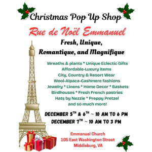 Wreaths, plants – Unique Gifts, Affordable-Luxury items – Country, City & Resort Wear – Wood-Alpaca-Cashmere Fashions – Jewelry – Linens – Home Decor – Baskets – Birdhouses – Fresh French Pastries – Hats by Nezzie – Preppy Pretzel & so much more!