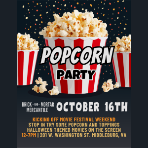 Kicking of Film Festival week at Brick and Mortar Mercantile with a Popcorn Party. Stop by for a bag of fresh popped popcorn, try some new seasonings, wash it down with a cold beverage, and watch a movie on the big screen. Stop in before or after your movie and don’t forget we will be open until 7pm! Look forward to seeing you all there.