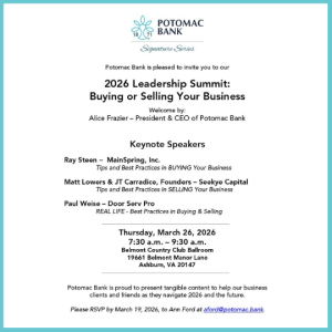 As part of its ongoing Signature Event Series, Potomac Bank proudly presents meaningful, practical content designed to support business clients and friends as they navigate 2026 and the years ahead. Guests are invited to enjoy a light breakfast at Belmont Country Club, followed by a warm welcome from CEO Alice Frazier.