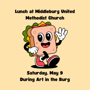 Middleburg United Methodist Church will offer boxed lunches during Middleburg’s “Art in the Burg” event on Saturday, May 9. Lunches are $10 and include a sandwich, chips, soda, and a cookie!