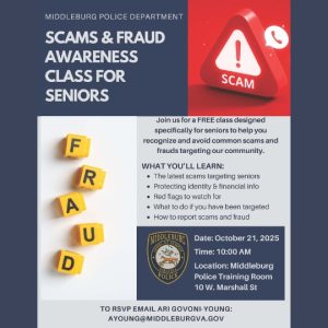Join the Middleburg Police Department for a FREE class designed specifically for seniors to help you recognize and avoid common scams and frauds targeting our community.