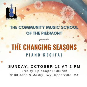 The Community Music School of the Piedmont presents The Changing Seasons: A Piano Recital on Sunday, October 12 at 2:00 PM at Trinity Episcopal Church. Pianists Jisoo Kim and Andrew Wood will perform an inspiring program of works by Debussy, Beethoven, Chopin, and Rachmaninoff, celebrating the beauty and character of the seasons. Admission is by donation, and all are warmly invited to enjoy this afternoon of exceptional music.