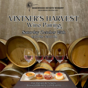 Join Boxwood for a Vintner’s pairing. Seated in the cave surrounded by French barrels sampling for the first time Boxwood’s top new single varietals and past anniversary vintage paired with a fresh harvest bounty.