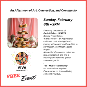 Celebrate an afternoon of art, connection, and community featuring the artwork of Carla O’Brien, while enjoying tea and a special presentation of Carla’s Heart, and inspirational children’s book.